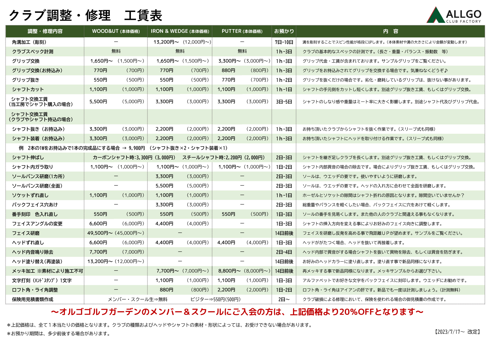 • 料金表