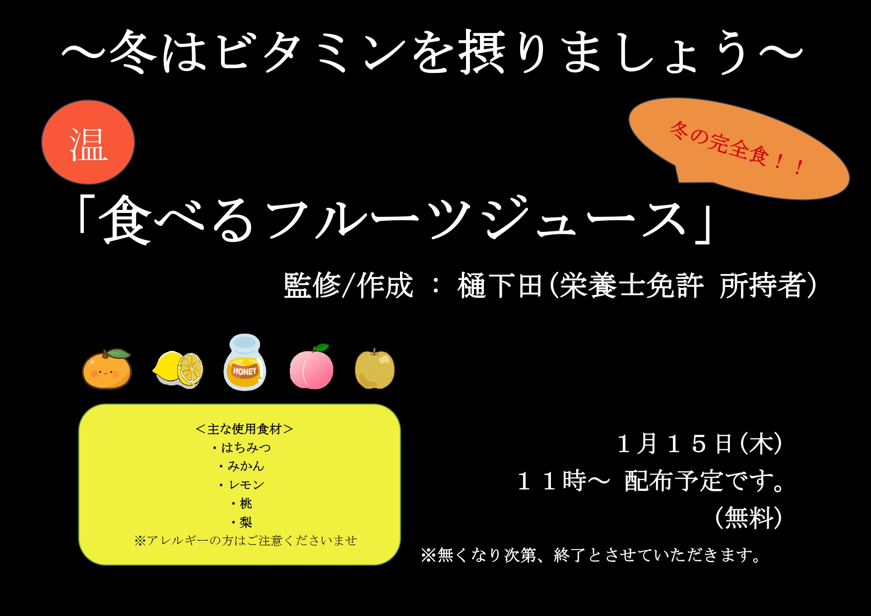 1月15日(木)の11時~は「冬の完全食!食べるフルーツジュース」を無料配布いたします ◎監修/作成:樋下田(栄養士免許所持者)
